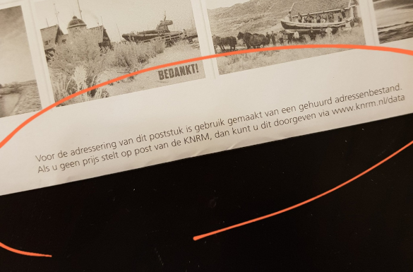 Deze brief vond ik op de mat en dacht: Goed doel, maar hoe komen deze mensen aan mijn adres? Op de achterkant staat dat de KNRM gebruik heeft gemaakt van een 'gehuurd adressenbestand' – laat dat maar even op je inwerken.