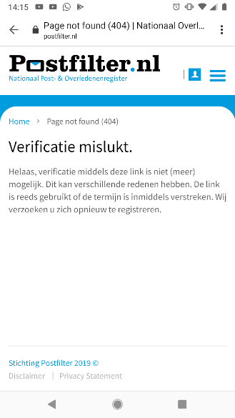 Toen zat ik al aardig met mijn tanden in het toetsenbord, des te meer omdat de NEE/NEE-sticker op mijn brievenbus toch redelijk leek te werken. Op postfilter.nl mag men een, jawel, gebruikersnaam en wachtwoord aanmaken (waarom o waarom), waarna alleen nog even op de verificatielink in een e-mail moet worden geklikt. Die een 404-melding opleverde.
